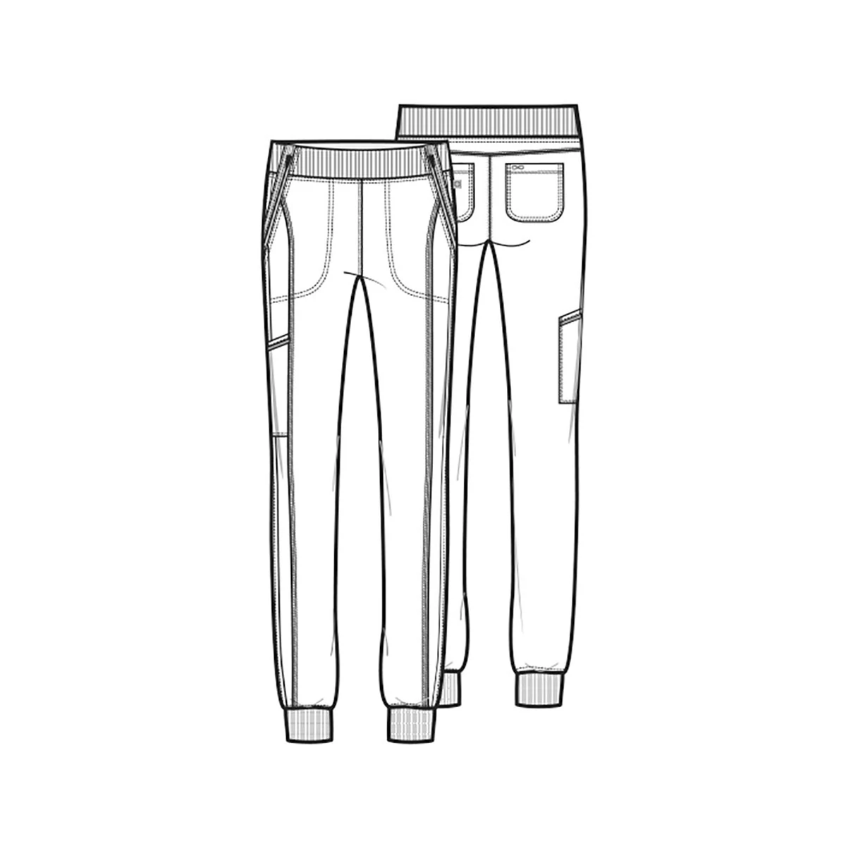 A Contemporary fit, mid rise, tapered leg jogger pant features a rib knit elastic waistband with front angled zipper pockets, a cargo pocket with reflective tape, two back patch pockets, rib knit leg bands for adjustable length and coverstitch detail throughout.
