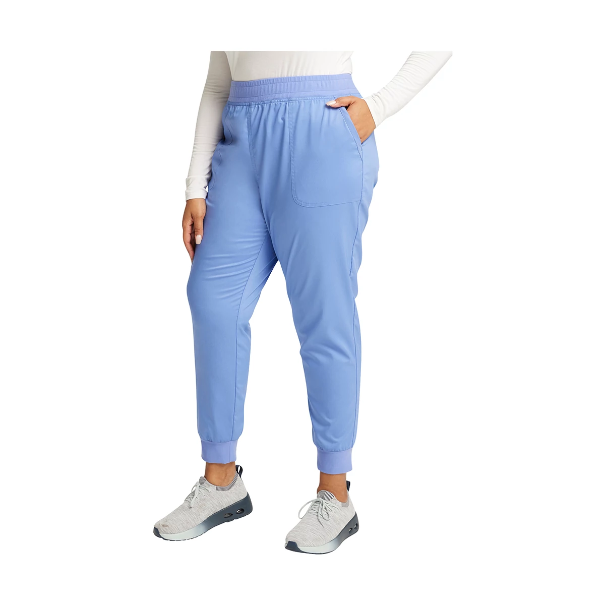 This Modern Classic fit mid rise pull-on jogger has an encased elastic knit waistband with interior drawstring. There are five pockets: two front patch pockets, a double cargo pocket with a bungee ID badge loop, and one back patch pocket. The pant also features a tapered leg and knit cuffs.