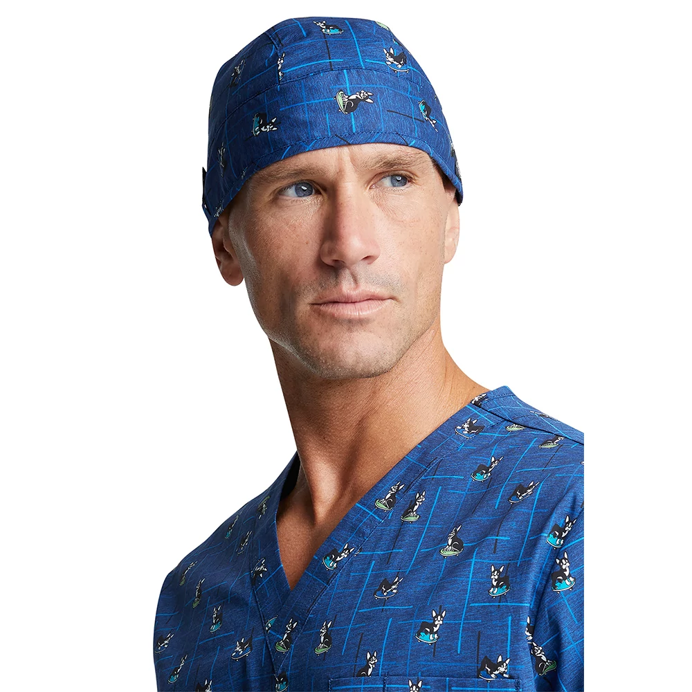 This adjustable print scrubs hat features snap tabs by ears to comfortably hold a protective face mask in place. (Mask sold separately.) Hat includes terry cloth sweatband for comfort and contoured seaming with back elastic and tie for a better fit. Always wash and dry face covering before and after each use. Unisex fit.
