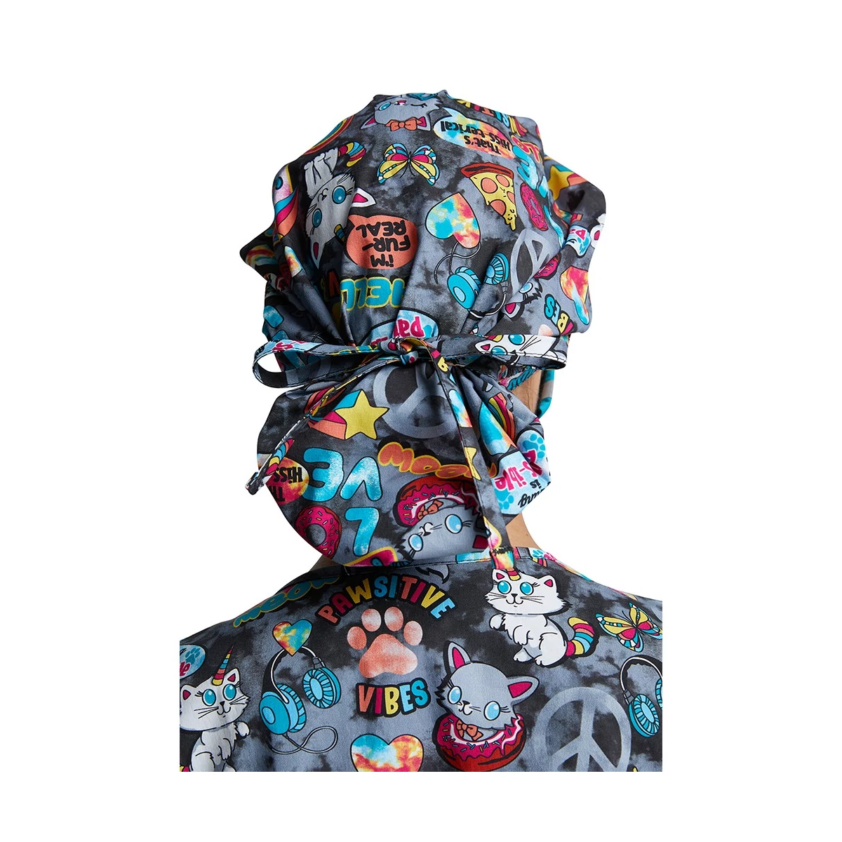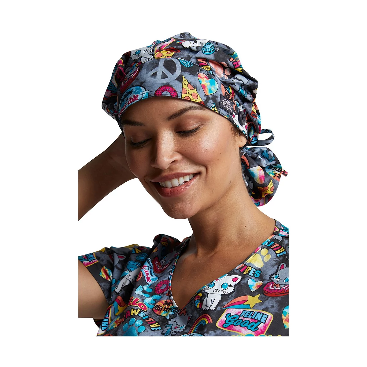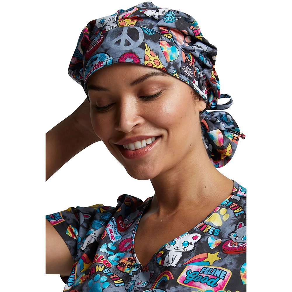 This roomy bouffant scrubs hat features buttons by ears to comfortably hold a protective face mask in place. (Mask sold separately.) Hat also includes front pleats with enough fullness for complete hair coverage and terry cloth sweatband for comfort. Back elastic plus adjustable tie for a secure fit. Unisex fit.