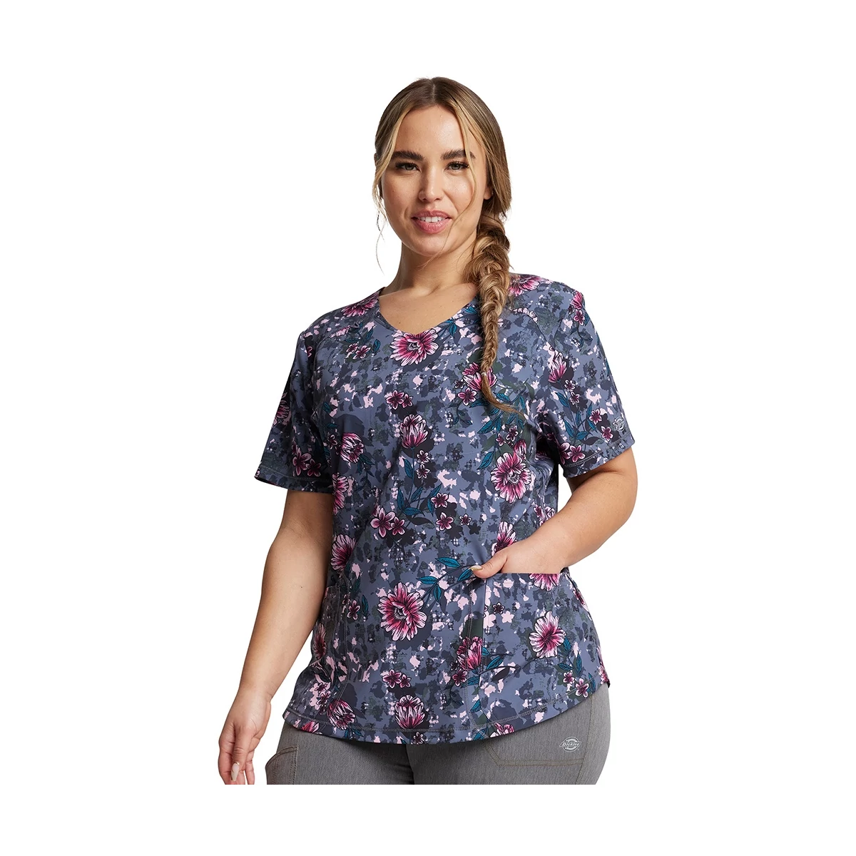 This Contemporary fit V-neck print top has front yoke seams, a bungee ID badge loop on the wearer's right yoke seam and a back yoke seam. Other features include two front patch pockets and side vents.